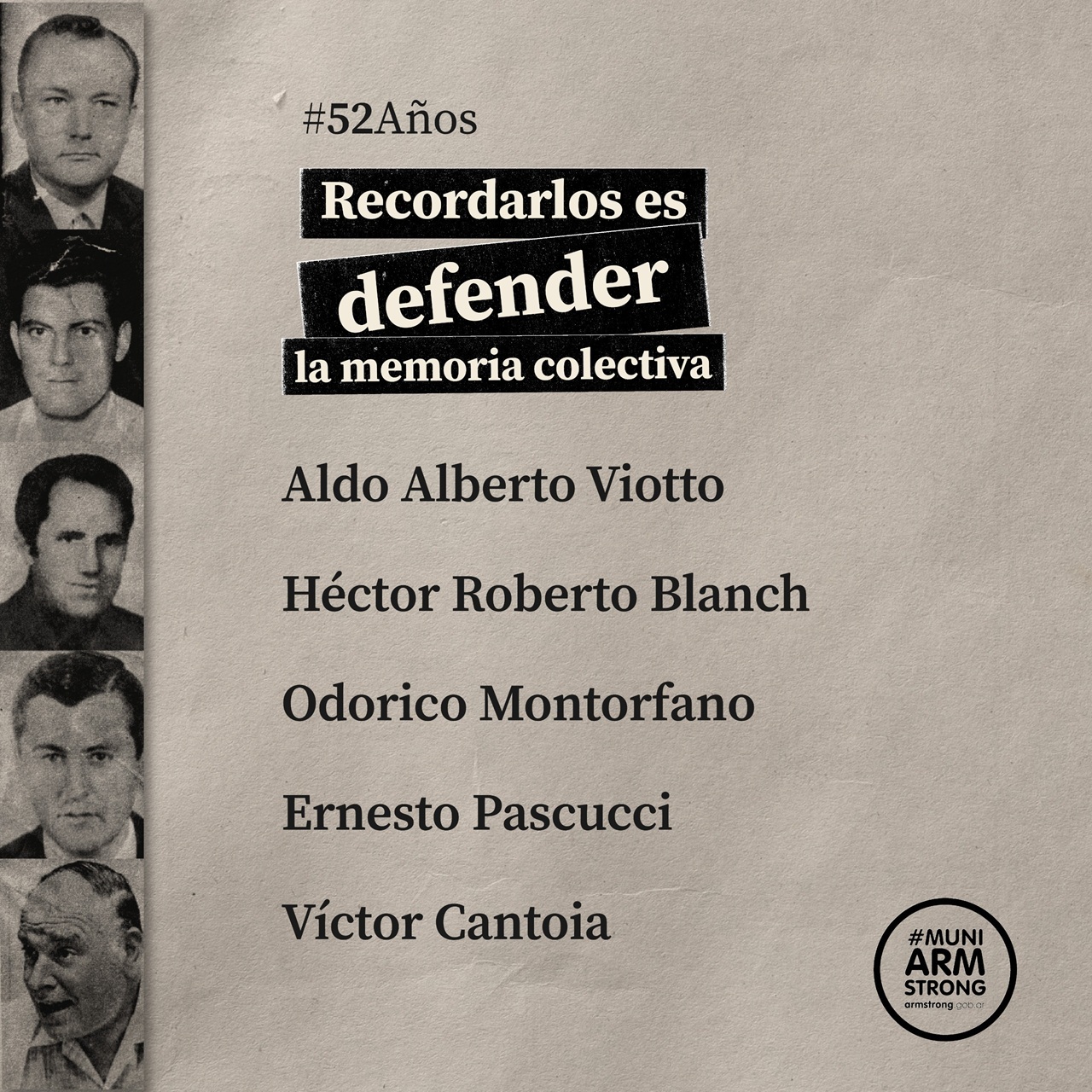 En este 2026 se cumplen 52 años del asesinato de Víctor Cantoia (Gerente), Aldo Alberto Viotto (Jefe de Contaduría), Héctor Blanch (Jefe de la Sección Tienda), Ernesto Pascucci (Jefe de la Sección Almacén), integrantes de la Cooperativa Agrícola Ganadera de Armstrong y Odorico Montorfano (Supervisor contable de la FACA, delegación Rosario), que los acompañaba.