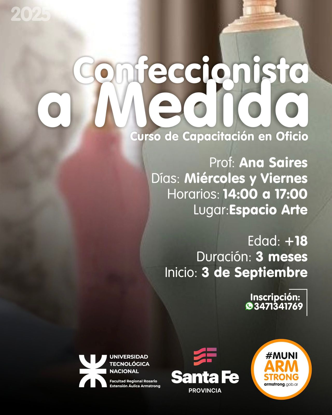Municipalidad de Armstrong informa que hasta el viernes 29 de agosto está abierta la inscripción para el curso de capacitación en oficio de confeccionista a medida que se desarrollará desde el 3 de septiembre en la Estación Arte y estará a cargo de la Prof. Ana Saires.